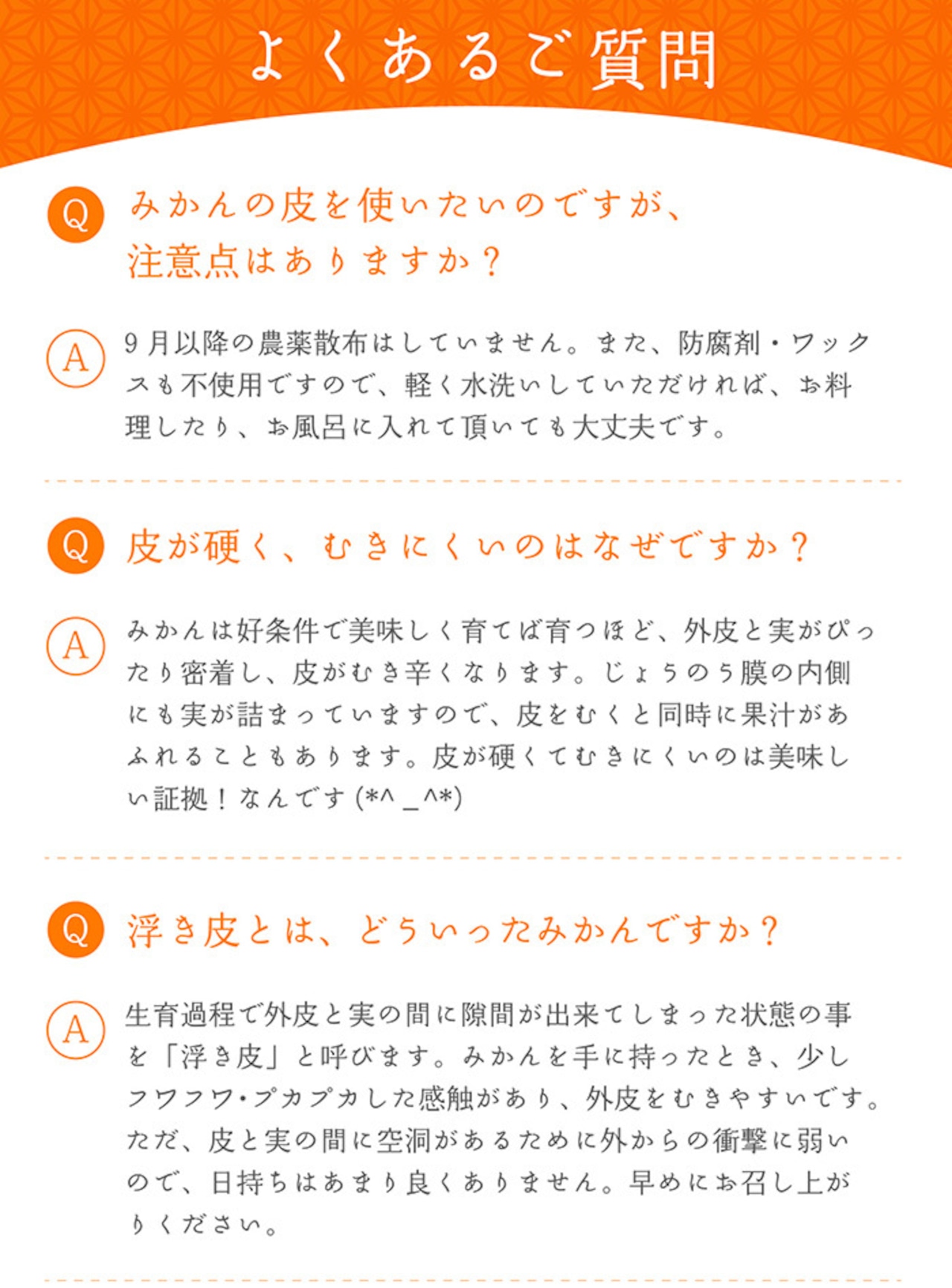 酸味と甘みのバランスが良いと人気の温州みかん品種。栽培期間中の農薬使用を控えて生産し、防腐剤・ワックス不使用のため、皮まで安心してお使いいただけます。