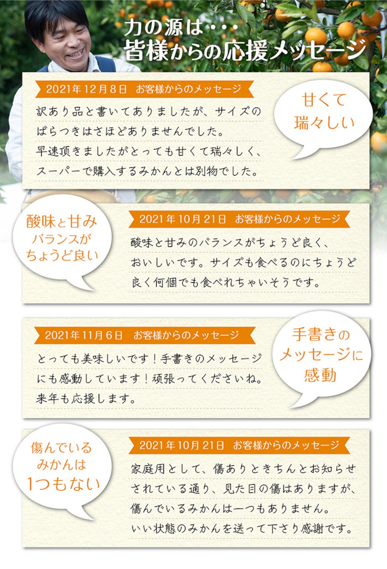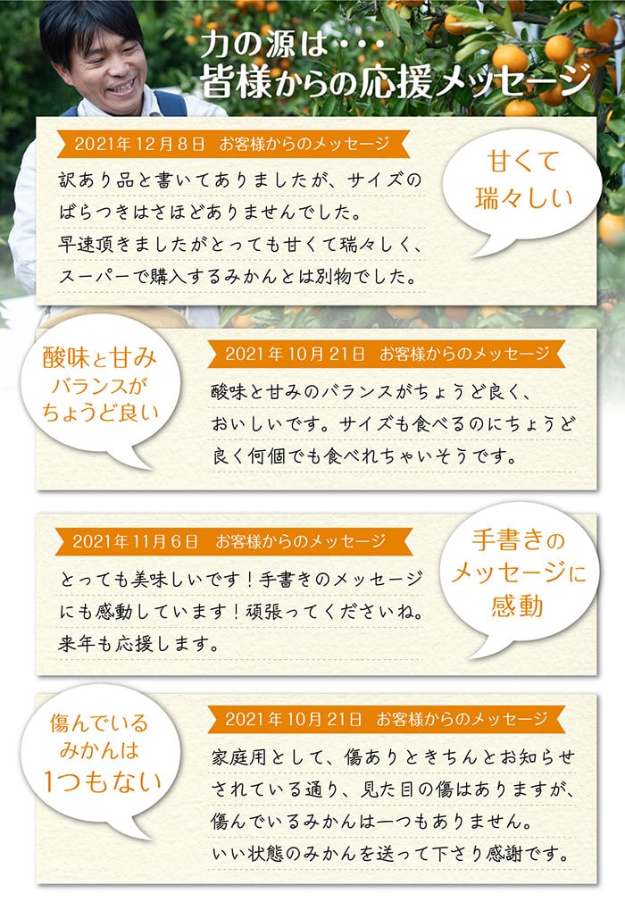 ・みかんはデリケートな果実のため、配送中に多少なりとも荷傷みが起きることが多いです。傷んだ果実は早めに取り除き、できるだけ早めにお召し上がりください。