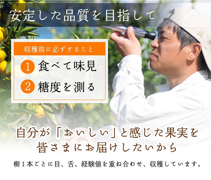・みかんはデリケートな果実のため、配送中に多少なりとも荷傷みが起きることが多いです。傷んだ果実は早めに取り除き、できるだけ早めにお召し上がりください。