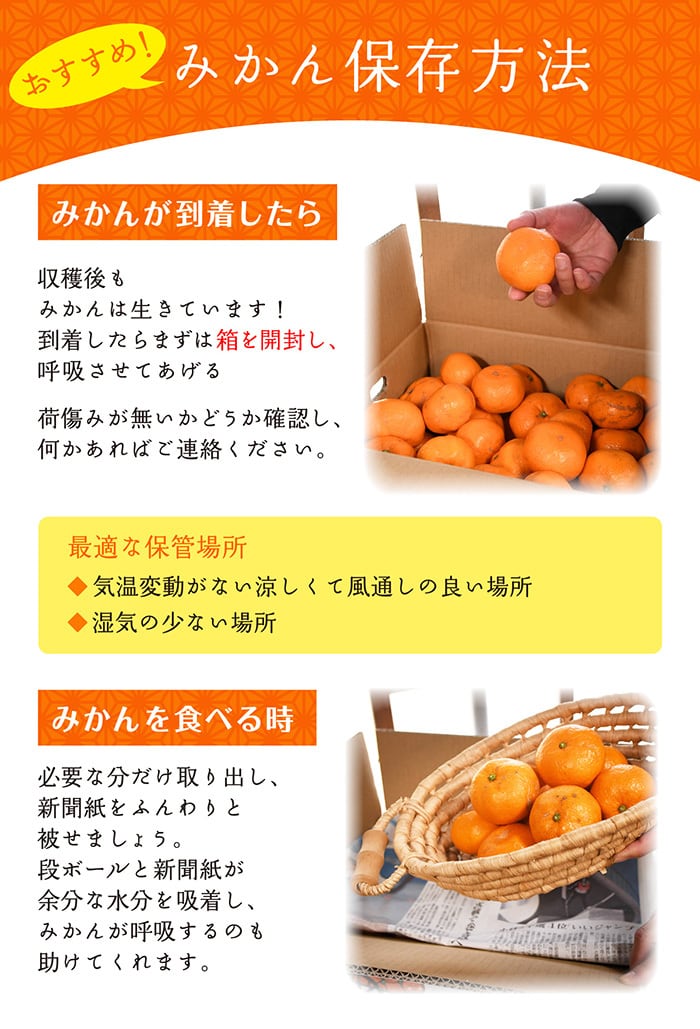 ・段ボールで保管する場合は、上蓋を開封し、みかんの上にふんわりと新聞紙をかけて、風通しがよく、湿気のない冷暗所で保管して下さい。